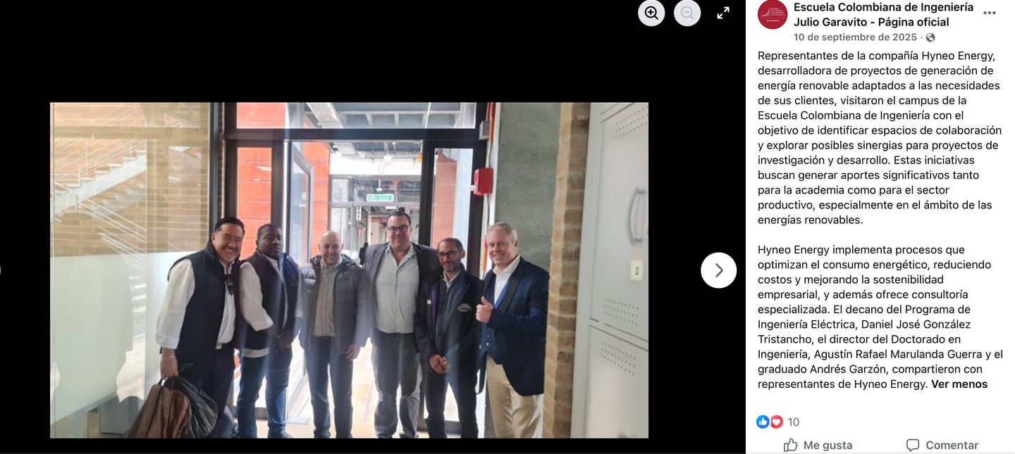 Hyneo Energy y la Universidad Escuela Colombiana de Ingeniería Julio Garavito continuarán trabajando en la definición de acuerdos de colaboración que permitan transformar ideas en proyectos concretos, con el propósito de apoyar la transición hacia un modelo energético más eficiente, descentralizado y sostenible.
