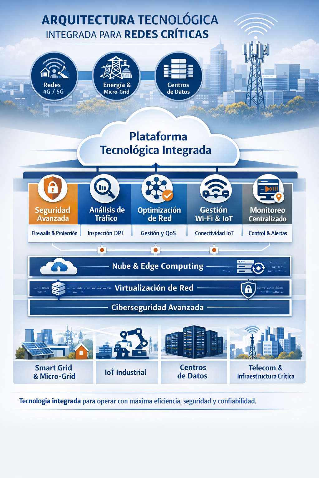 Estas plataformas están diseñadas para soportar redes de comunicaciones modernas, sistemas energéticos inteligentes, micro-grids, IoT industrial y centros de datos, garantizando monitoreo en tiempo real y protección contra amenazas digitales.